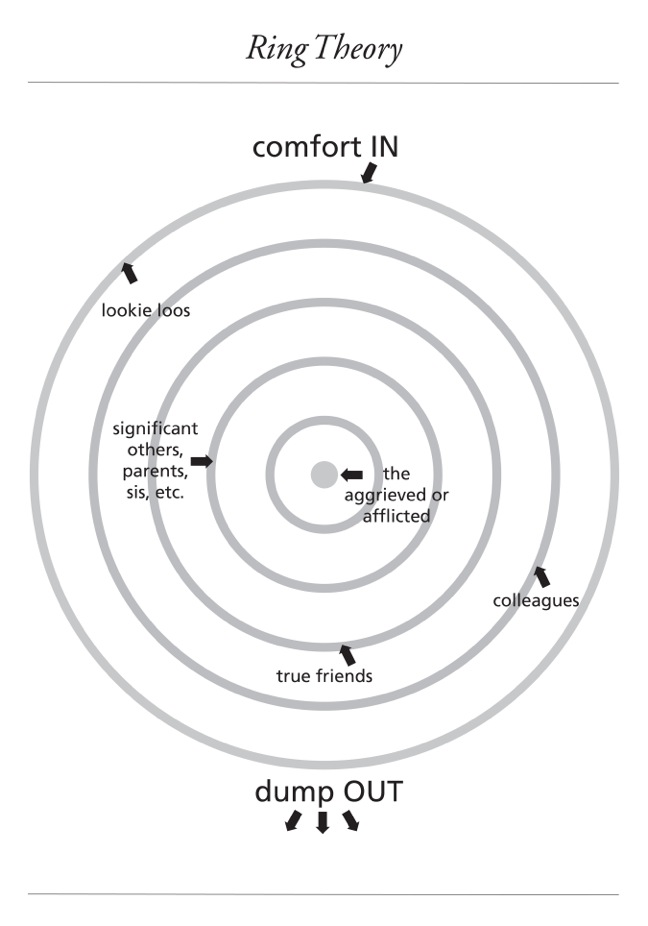 One aspect of this idea is that it helps determine the flow of care or energy. In the center is where the care flows in. But the center isn’t in a position to provide care or support to the other, outer circles, surrounding the situation. It also means that if you are interacting with another who “resides” in a circle closer to the center than yourself, we shouldn’t dump emotionally upon their shoulders. They cannot carry our emotions. It doesn’t mean we can’t have strong emotional responses to the situation. It just means that we may need to lean on the shoulder of someone who isn’t immediately impacted.