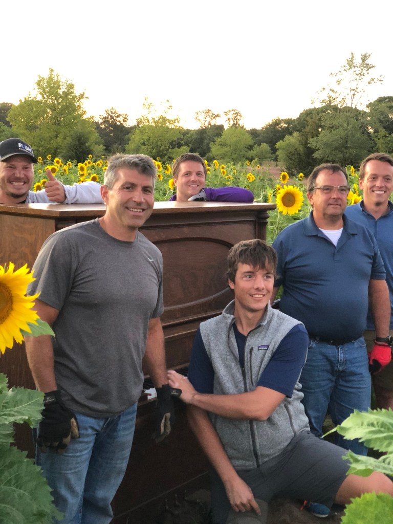 This earlier timeline also meant that I had to get going on a surprise I wanted to place in this special field! Madie had a degree in music ministry. She often used her gift of music to connect with others. I wanted to place a piano in the field. I wanted to surprise Ben and Madie’s family. I rallied Ben’s brothers and father along with my husband and his trailer. They moved a very solid old piano! It was so cool that they were making this vision a reality. While watching the guys load this heavy piece, I found out that it was rescued from an old church! (of course it was!) We got it loaded and I receive a text from Ben, “I am here at the field and it looks amazing!” OK! Well I guess the surprise is on us! We still brought the piano out and met Ben there. It was still a grand surprise and maybe even more so when we recruited him to help move it into place!